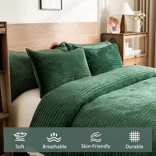 Luxury Velvet Quilt Set Queen Size 3 Pieces,Soft Cozy Oversized Striped Velvet Comforter Set with 2 Pillow Shams,Lightweight Coverlet Bedspread Bedding Set for All Seasons(Forest Green