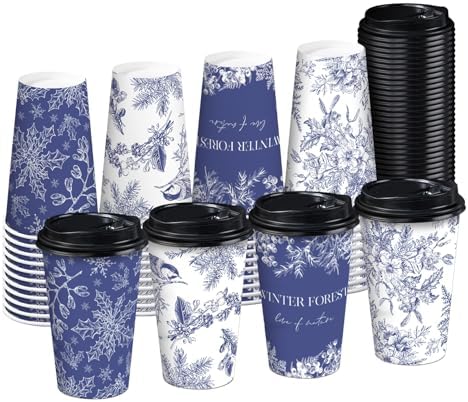RUSPEPA Disposable Paper Coffee Cups with Lids 16 oz - 48 Pack Christmas Blue and White Design Printed Paper Drinking Cups