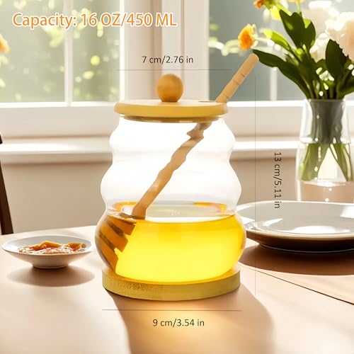 450ml Glass Honey Jar with Wooden Dipper & Tray - Thick Heavy Glass Honey Pot Set