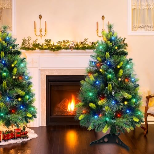 2 Pack 3.5 FT Artificial PE Fraser Fir Christmas Entrance Tree with 50 Multi Color Change Light 8 Mode Remote Control Realistic-Feel Xmas Tree Decor Battery Operated for Porch Front Door Home