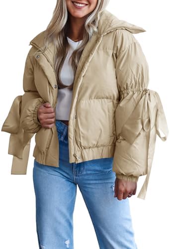 Tankaneo Womens Bow Puffer Jacket Winter Warm Cropped Quilted Jackets Baggy Short Down Coats