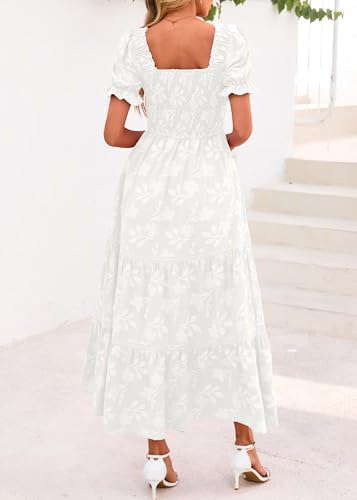 Lazysmile Women's Summer Boho Floral Maxi Dress Short Sleeve Square Neck Smocked Ruffle Elegant Wedding Guest Dress