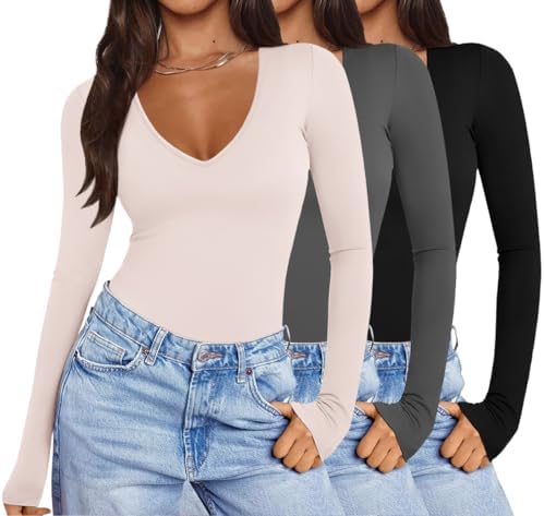 Ekouaer Deep V Neck Shirts for Women Low Cut Long Sleeve Tops Slim Fit Basic Cleavage Tees Deep Plunge Thermal Tshirts XS-XXL
