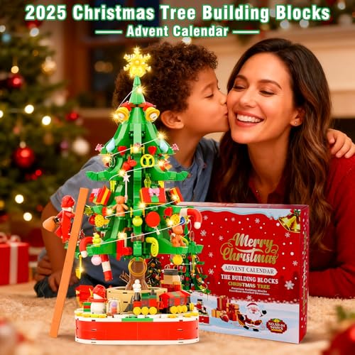 Christmas Tree Building Blocks Advent Calendar 2025 with Lights - 949 Pcs Holiday Countdown Calendar for Kids Adults Teens Family Activity