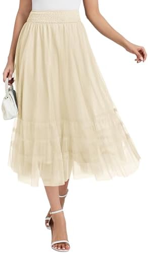 Casly Lamiit Women's Midi Skirt Casual Tulle Skirt Elastic High Waisted Skirts Flowy Tiered A Line Skirts