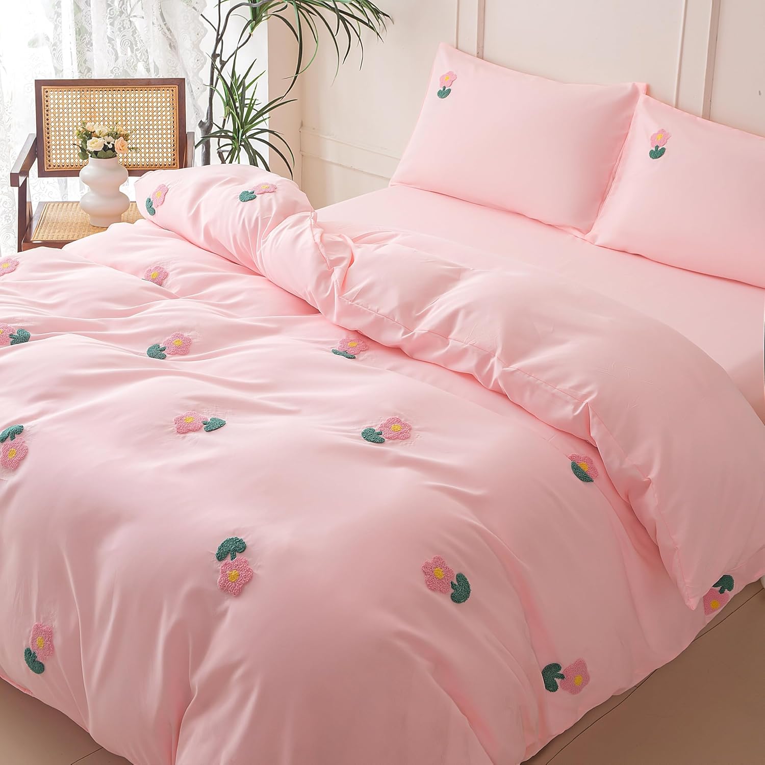 MWMWMW 5 Pieces Girls Queen Size Bedding Set, Cute Pink Floral Comforter Set, Pink Floral Bedding Queen