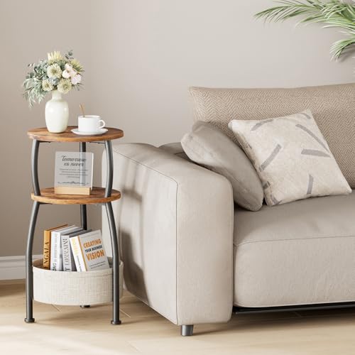 Round Side Table for Small Spaces with Storage Basket –Small End Table 3-Tier Night Stand Sofa Corner Table for Living Room