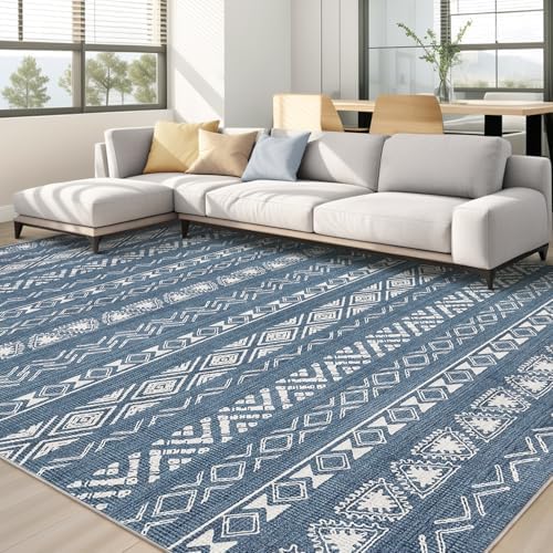 Area Rug Living Room Rugs - 8X10 Washable Boho Farmhouse Bohemian Neutral Large Moroccan Geometric Soft No Slip Indoor Thin Floor Carpet for Bedroom Under Dining Table Home Office -Blue