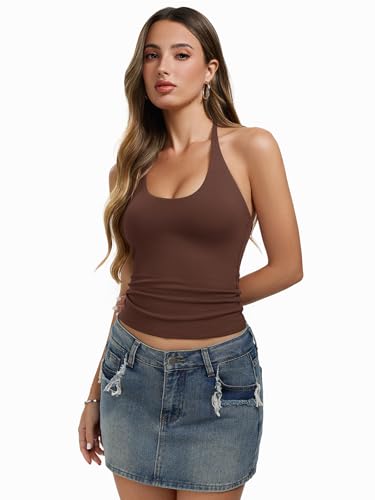 REORIA Women's Basic Scoop Neck Backless Double Lined Braless Tie Halter Tank Tops Cute Summer Trendy Sleeveless Shirts