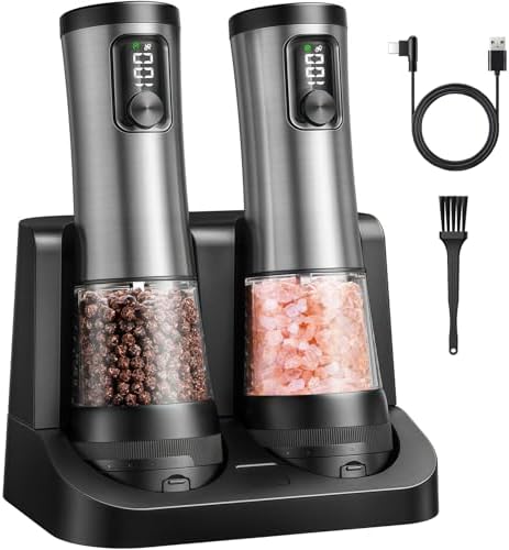 Electric Salt and Pepper Grinder Set - Ceramic Grinder Automatic Pepper Mills with Battery Display Rechargeable Base