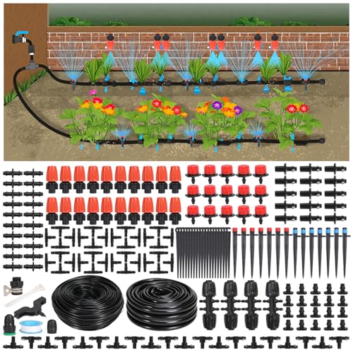 230FT Drip Irrigation Kit-221pcs Quick Connector Garden Watering System- Irrigation System Patio Misting Plant Watering System -1/4 inch 1/2 inch Irrigation Tubing Hose Adjustable Nozzle