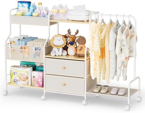BBLIKE Diaper Caddy Organizer with Hanging Rack - 3 Tier Rolling Utility Cart with Drawers and Dividers for Baby Bottle Storage - Bedside Cart for Changing Station