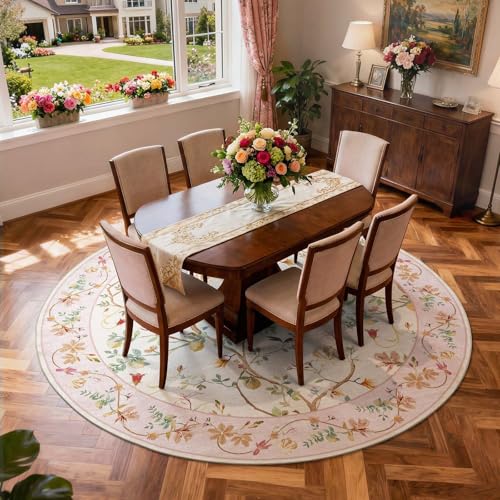 jinchan Floraison 8Ft Circle Rug Floral Washable Carpet Non Slip Indoor Netural Flower Large Area Rug Round Low Pile Soft Carpet for Living Room Bedroom Dining Room Pink