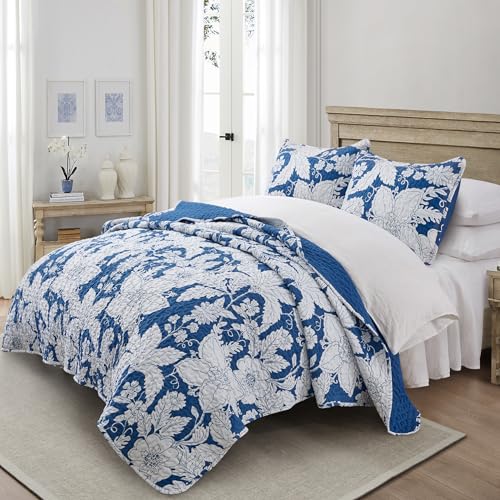 Floral Bedding Quilt Set Bedspread - Blue Floral Quilt Lightweight Reversible Dyed Oversized Bed Spread Coverlet with 2 Pillowsham for Home All Season Tropical Royal Luxury (Queen)