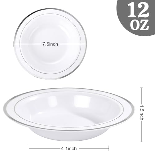 bUCLA 120 Pack Disposable Plastic Bowls 12oz - Elegant White & Silver Trim Party Bowls for Salad
